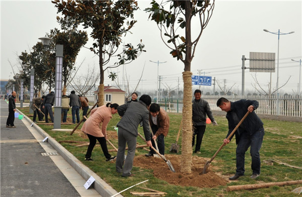 植樹現(xiàn)場,一派熱火朝天的勞動景象,大家熱情高漲、干勁十足,分工協(xié)作,默契配合,定行、鏟土、填坑、澆水,每道工序都進行的十分細(xì)致、認(rèn)真。經(jīng)過一番辛勤勞動,共栽種廣玉蘭40余棵,一行行新栽下的玉蘭樹昂然挺立,在和煦的春風(fēng)中展現(xiàn)著蓬勃生機。