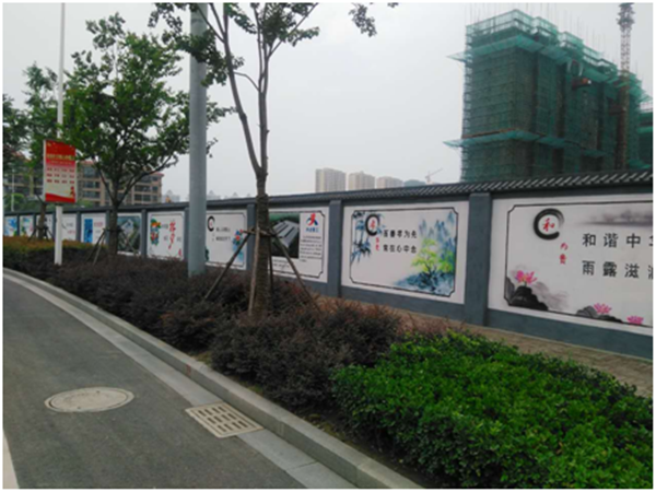 目前,現(xiàn)場(chǎng)各項(xiàng)安全文明設(shè)施正在緊鑼密鼓的建設(shè)中,其中臨時(shí)圍墻不僅是工地對(duì)外展示的第一形象,也是企業(yè)宣傳、安全宣傳、方案公示等信息的展示平臺(tái)。項(xiàng)目部通過人工手繪結(jié)合局部噴繪的方式既宣傳了創(chuàng)文、創(chuàng)衛(wèi)、核心價(jià)值觀的標(biāo)語,又營(yíng)造了“青磚綠瓦”的江南韻味。為園區(qū)的創(chuàng)文建設(shè)增添了新的亮點(diǎn)。