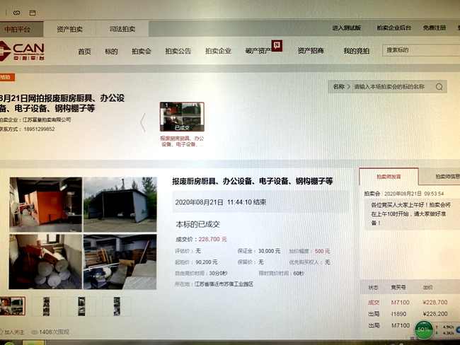 8月21日上午10時,城發(fā)公司報(bào)廢廚具、辦公設(shè)備、電子設(shè)備、鋼構(gòu)棚子等物資網(wǎng)上拍賣開始,7家競買人,經(jīng)過1小時44分10秒244次的緊張激烈競價(jià),最終以228700元成交標(biāo)的,比評估價(jià)90200元高出138500元,溢價(jià)率153.55%。