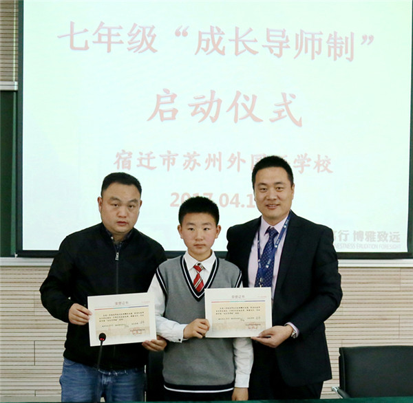 近日,宿遷市蘇州外國語學(xué)校七年級(jí)16位孩子和他們的家長(zhǎng)監(jiān)護(hù)人還有他們新認(rèn)的“干爹”“干媽”齊聚學(xué)校階梯教室,舉行隆重的簽約儀式。這些“干爹”“干媽”是學(xué)校給首批孩子們配的成長(zhǎng)導(dǎo)師,每位教師與一個(gè)孩子結(jié)對(duì),全方位關(guān)心孩子的成長(zhǎng),陪伴孩子們一起度過快樂而充實(shí)的初中生活,力求“個(gè)個(gè)進(jìn)步,人人成星”?!俺砷L(zhǎng)導(dǎo)師制”這種親情化、個(gè)性化、人本化的育人模式,是宿蘇外實(shí)施素質(zhì)教育,提升教育核心競(jìng)爭(zhēng)力的需要;是宿蘇外服務(wù)家長(zhǎng),擴(kuò)大教育品牌影響力的需要;是宿蘇外回報(bào)社會(huì),落實(shí)“兩聚一高”,建設(shè)和諧社會(huì)的需要。